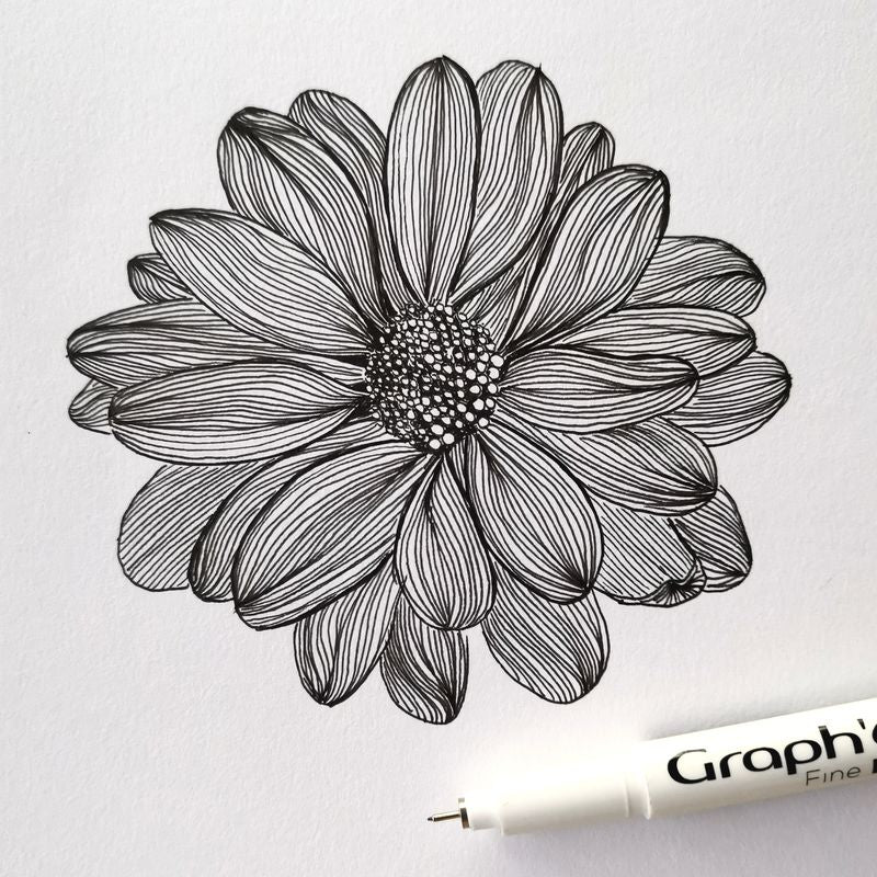 ovenover. Hold begge dele op mod vinduet, så du kan se stregen og tegn omridset op på papiret. Fyld blomsten med streger og mærk, hvor skøn en proces det er: afslappende, roligt, nærværende og mediterende. Blomsten ser måske kompliceret og svær ud, når den er færdig, men når du deler det op i de nævnte skridt, er