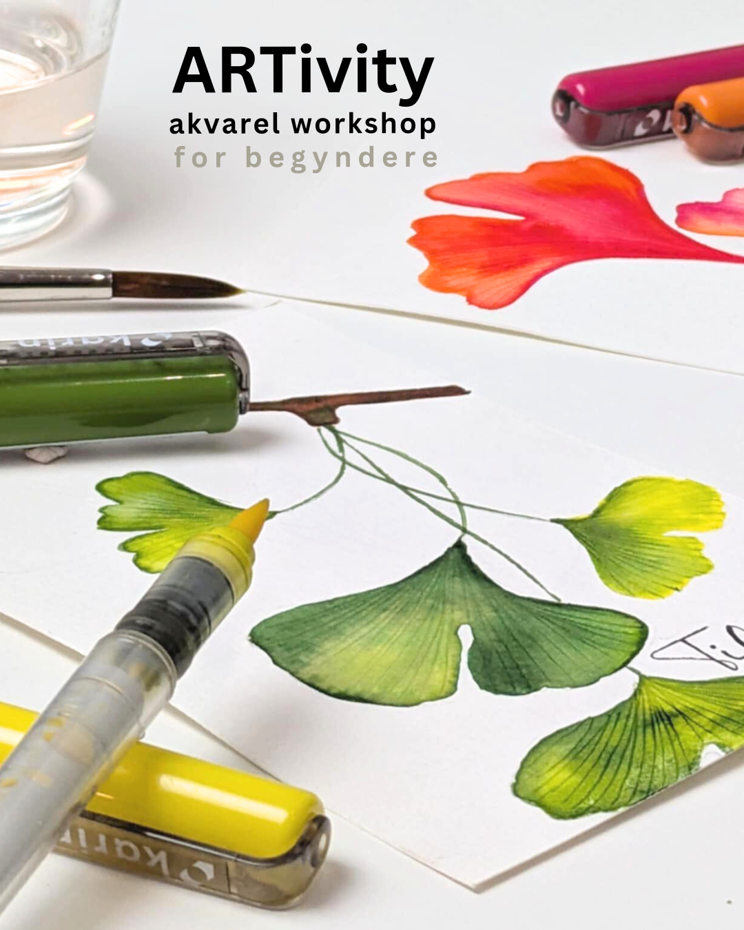 Du behøver ingen forkundskaber for at kunne være med. Workshoppen er målrettet voksne og unge. Den aktuelle workshop er ginkgoblade med brushmarkers. Undervisningen er gratis, men du skal købe en materialepakke for 92 kr. til denne workshop.