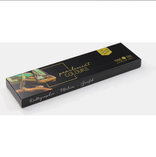 Denne Finetec æske består af en række perleskimrende, iriserende farver, alle lavet med etisk fremskaffet naturlig glimmer eller syntetiske substrater, der giver en virkelig smuk glans. En af dem er en Flip-Flop farve, der skifter farve, når du drejer den malede flade i lyset. Kan bruges både på hvidt og sort akvarelpapir.