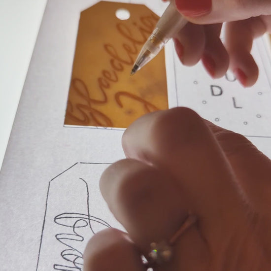 NB: De helt hvide manilla mærker du ser her på nogle af billederne er udgået fra producenten. De erstattes her med de æggeskalsfarvede og uden forstærkning rundt om hullet. Skabelonerne passer stadigvæk her til.