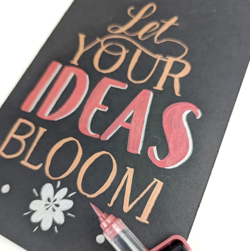 Jeg bruger også en normal pensel med meget lidt vand til at udligne overgange og farvenuancer. Tip: har du svært ved at udligne overgange ved brug af metallic farverne, anbefaler jeg at arbejde med vand ført på papiret og derefter tilføje metalfarven. Men de kan også bruges uden vand til fx farvelægning og handlettering.