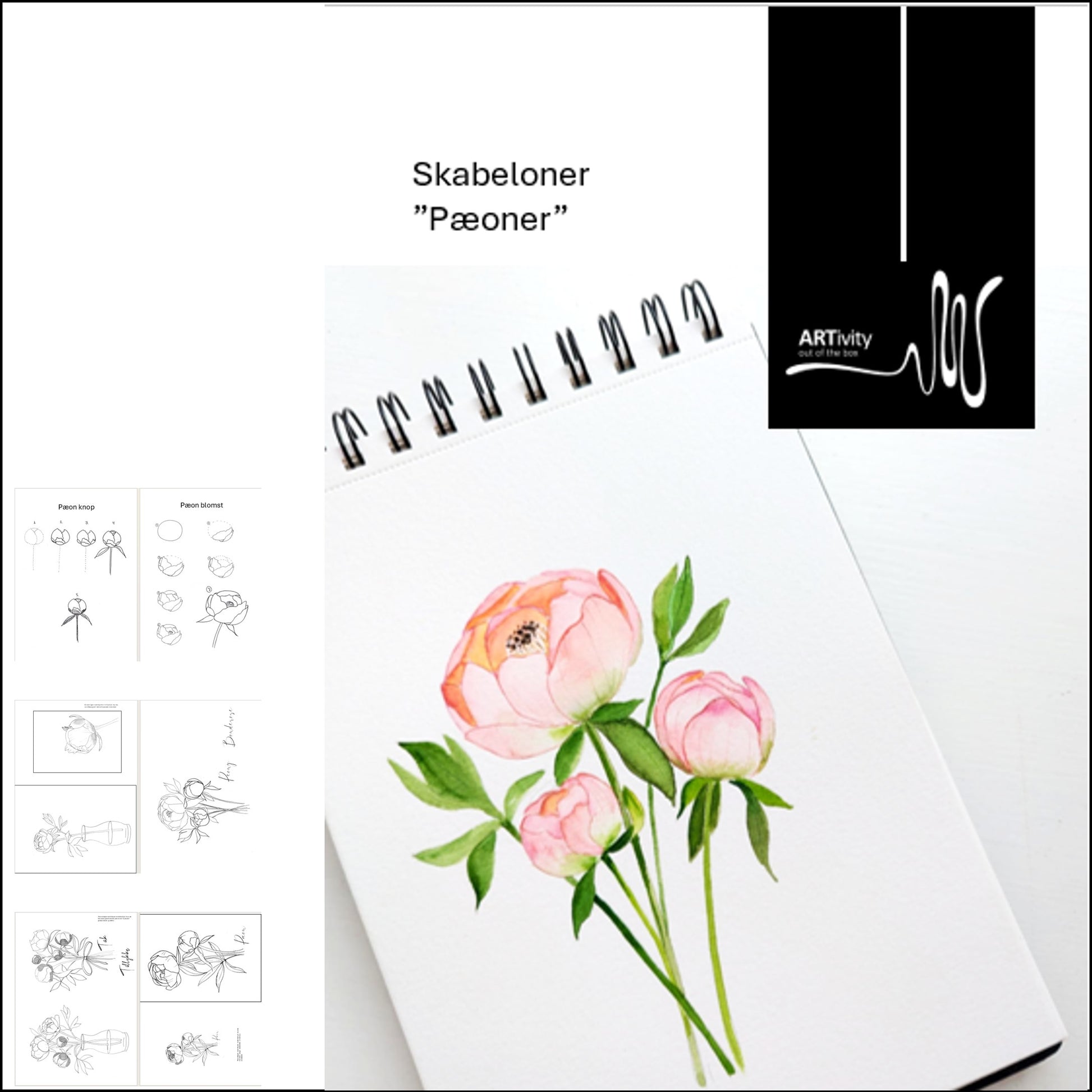 PDF til print med omrids/tegninger af pæoner/bonderoser.
